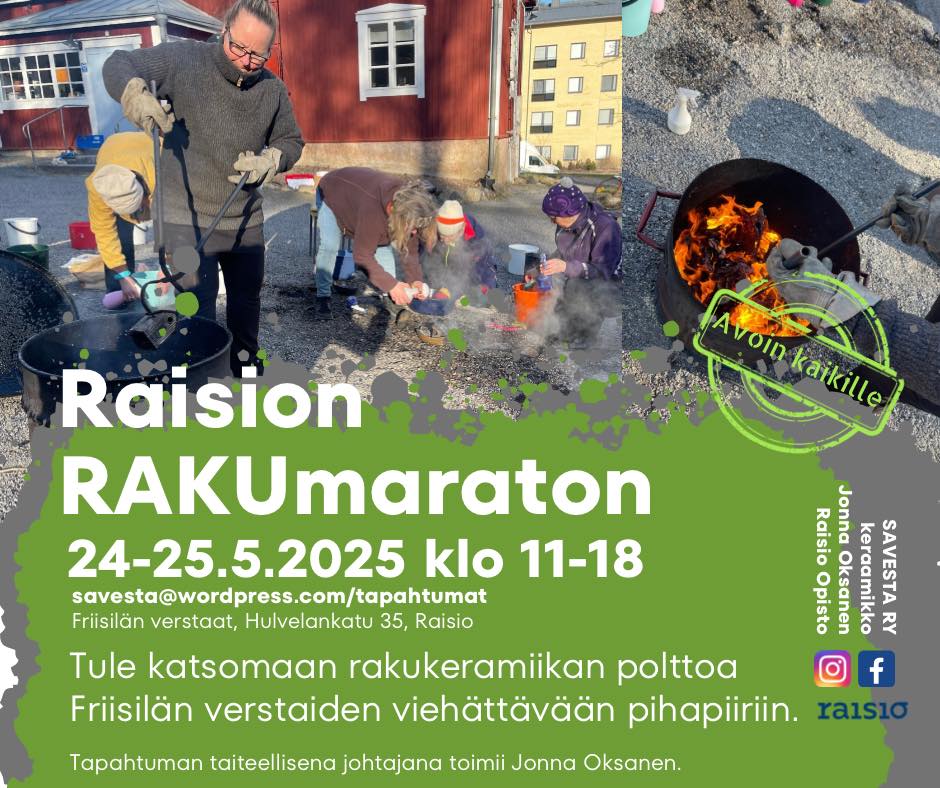 Tule mukaan rakukeramiikan nonstop-työpajaan Friisilän verstaille, Hulvelankatu 35, Raisio. Raision RAKUmaratonissa on mahdollista polttaa raku-, nakuraku-, obvara- ja aluminium foil saggar-tekniikoin rakukeramiikkaa. Käytössämme on useampi kaasu-uuni ja puilla poltettava raku-uuni. Poltettavien teosten maksimikoko on 30 x 30 pohja, ja maksimikorkeus 40 cm.